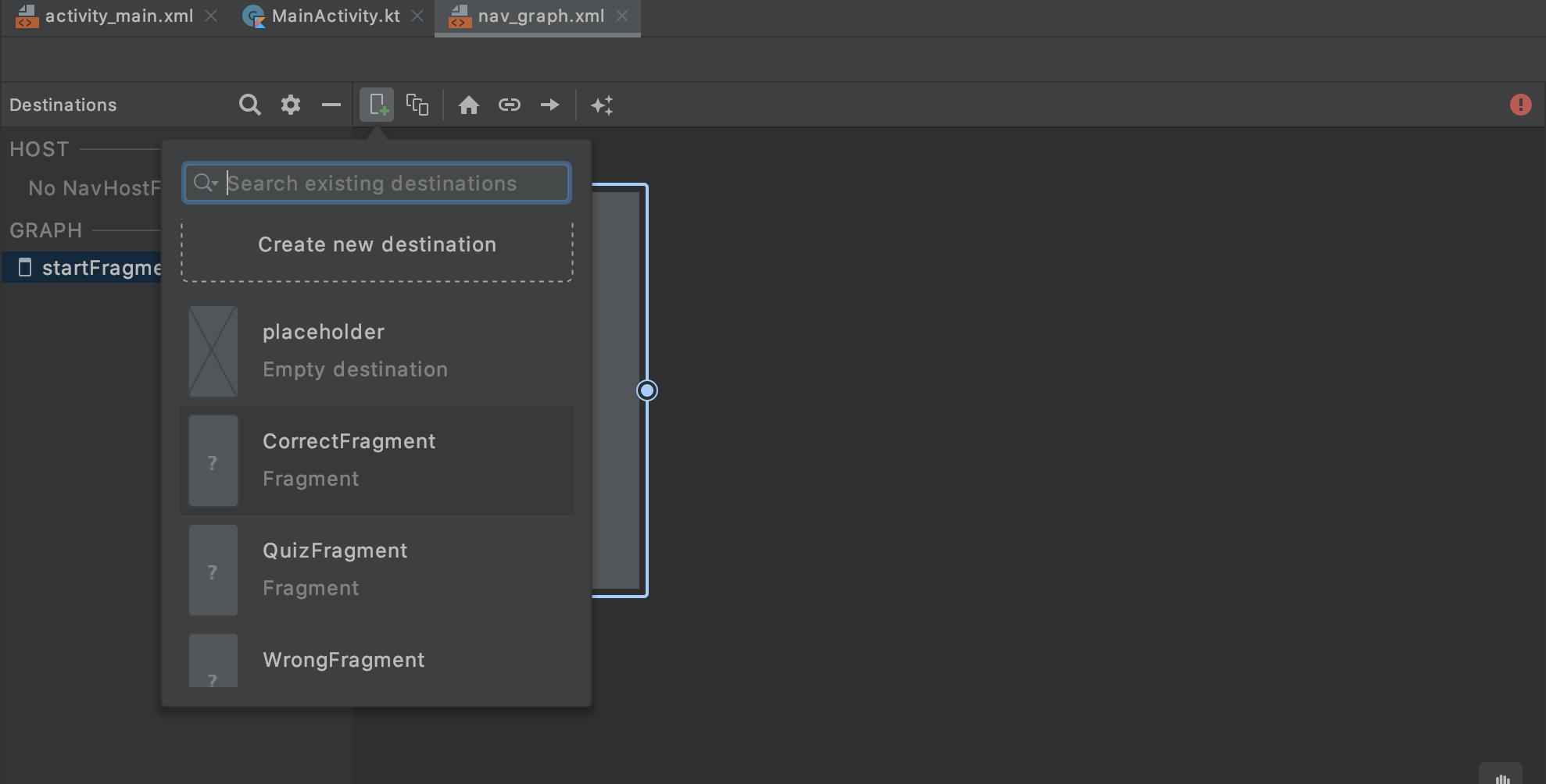 네비게이션 내에서 destination 이라고 하는, 우리가 미리 만든 페이지들을(프레그먼트와 레이아웃 파일) 추가해주겠습니다.