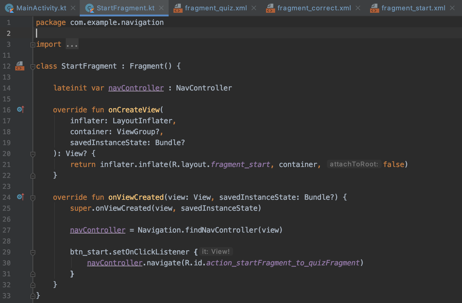 첫 시작 프레그먼트로 가서 버튼에 액션을 추가해주겠습니다.