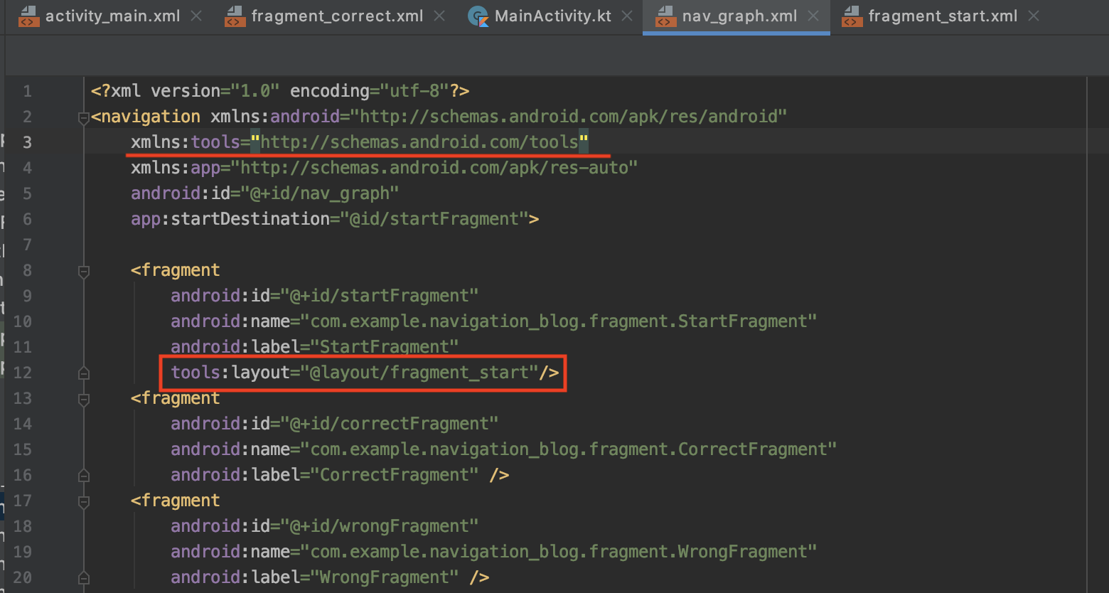 네비게이션 파일의 코드에서 프레그먼트와 해당 레이아웃을 tools:layout="@layout/layout_name" 이걸로 연결해줍니다.