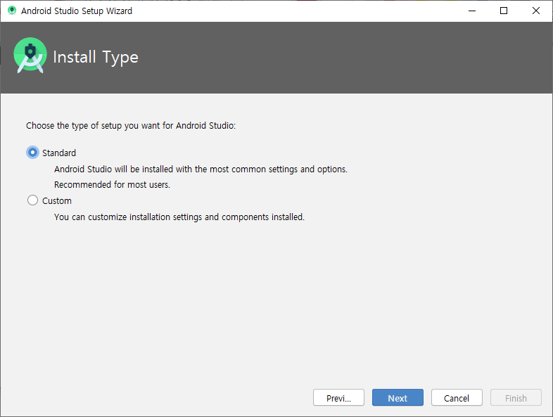 6. 안드로이드 스튜디오 설치 마법사가 실행되며 Next를 클릭하게 되면 추천메뉴 2가지가 뜨게됩니다.