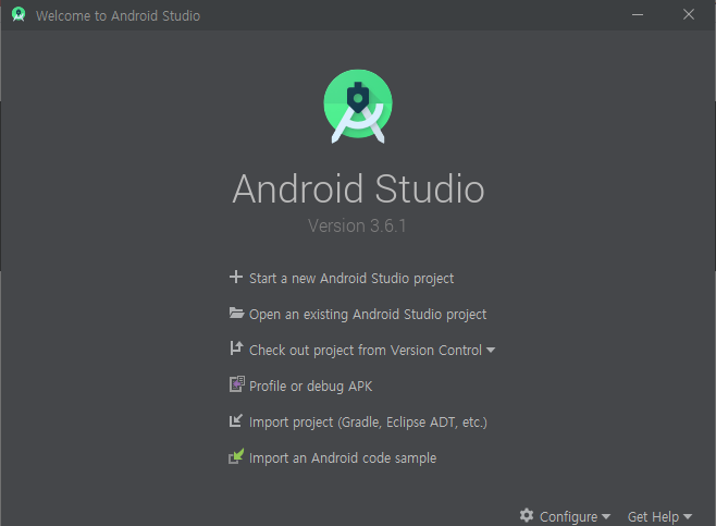 설치가 끝나고 안드로이드를 실행하면 제일 먼저 아래와 같은 창이 뜨게 됩니다.