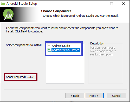 Android Virtual Device는 안드로이드 에뮬레이터에서 특정 스마트폰이나 태블릿, Wear OS, Android TV등을 정의하는 구성입니다. 즉 안드로이드 스튜디오에서 실제 기기 없이 가상으로 테스트 할 수 있게 해주는거니 꼭 체크하고 설치하시기 바랍니다.
