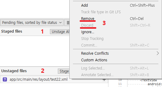 Stage All 로 올라갔었다면 Discard 후 다시 Unstage All 쪽으로 가지겠죠.